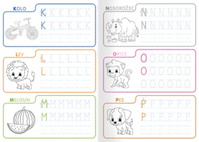 Grafomotorické pracovní listy knácviku psaní základních písmen v abecedě. Omalovánky jsou na ofsetovém 100 g papíru, mají 12 stran , vazba V1 - šitá skobami.